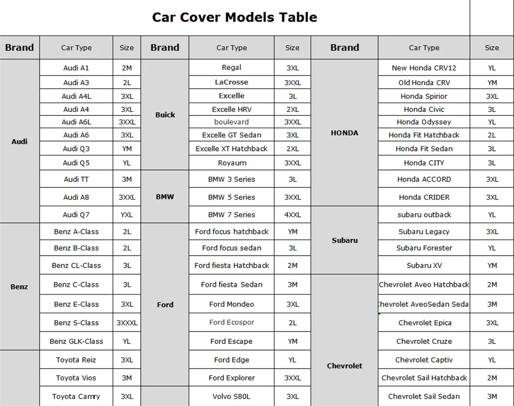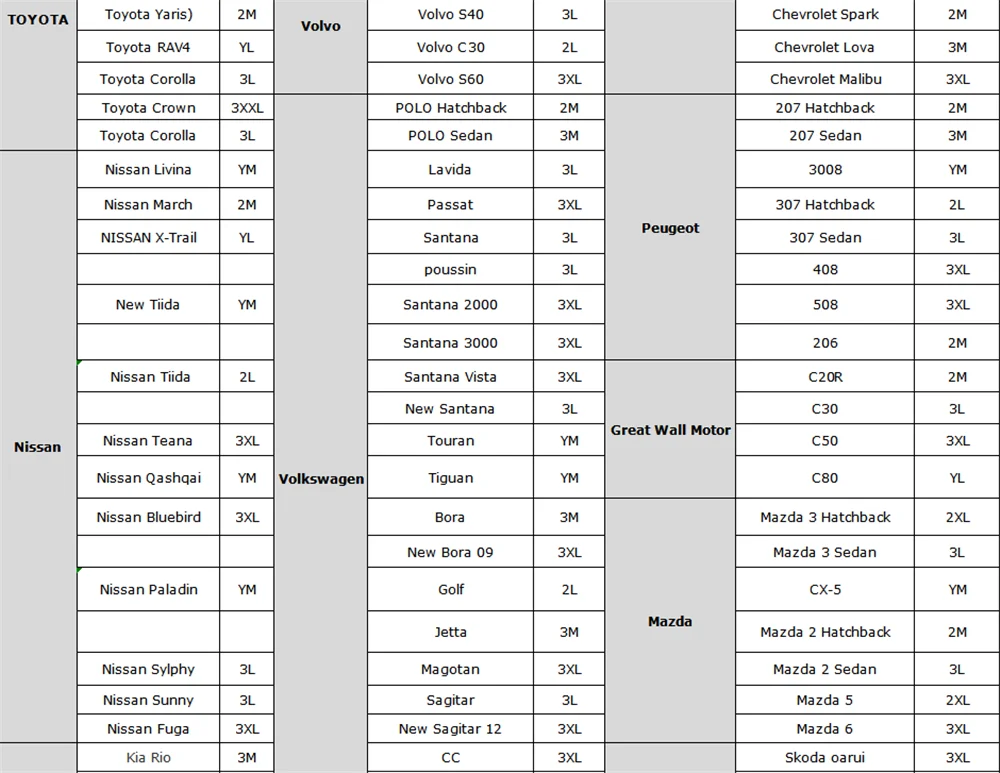 - Find the car model in the model table (in the end of page),that will show the right size